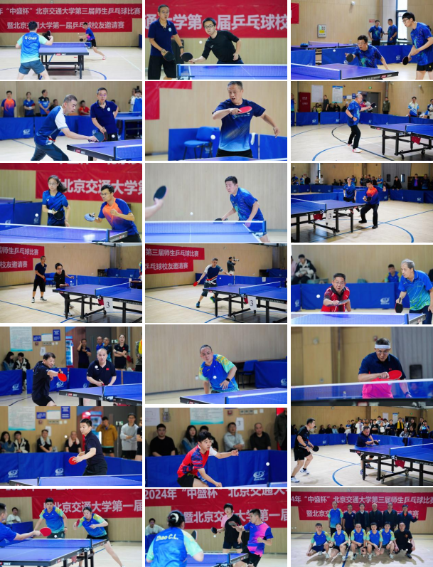 “中盛杯”首届校友邀请赛设置混合团体项目,4男1女组合团体,采用混双、男双、男单、女单、男单的五场三胜制比赛办法,吸引了国铁集团、铁科院、中铁电气化局、中盛轨道交通企业四家校外单位组成5支校友团队前来参赛,校内派出团队实力最强的4支单位院系代表队迎战。每支参赛队伍均配备乒乓实力超强选手,比赛进入刀光剑影、兵马厮杀的混战场面。