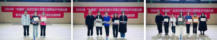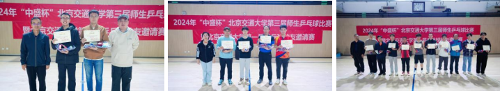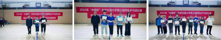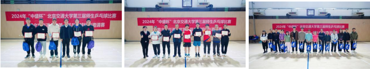 运输学院副书记、副院长、校教工乒协主席陈军华为师生杯混合团体冠军数统琴弦队颁奖,中国中铁乒协会长李盼龙为第二名土环斌燕队、第三名经管优学队颁奖,离退休处处长徐民为第四至第八名队伍颁奖。
