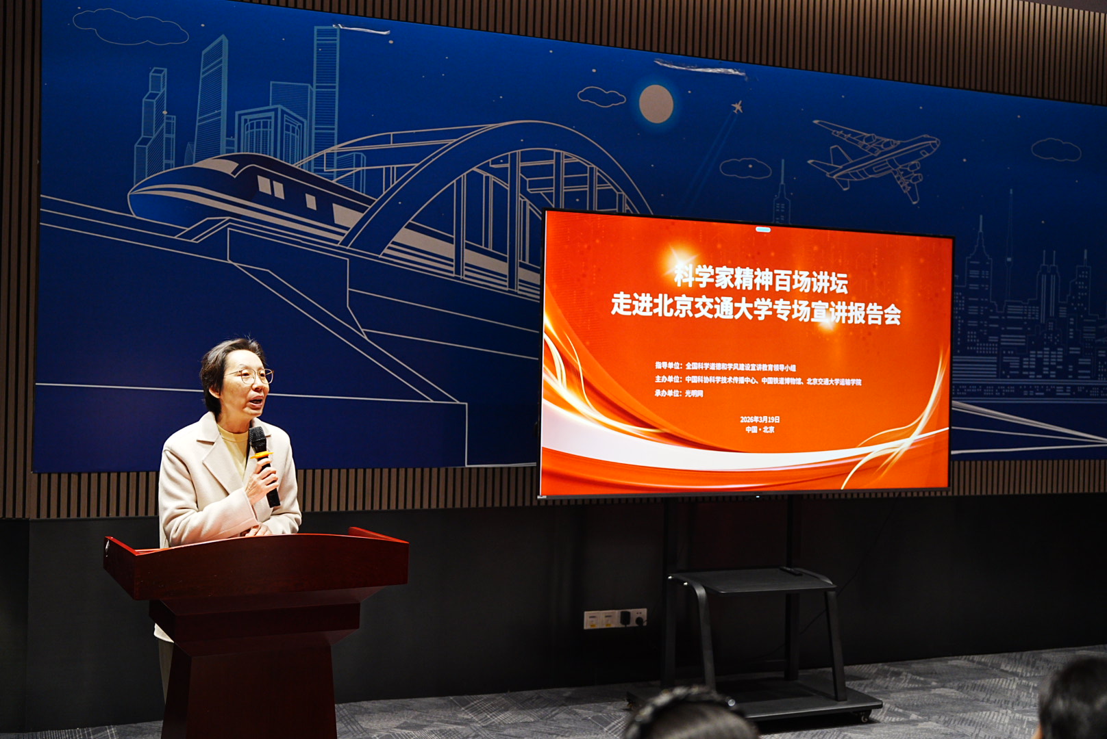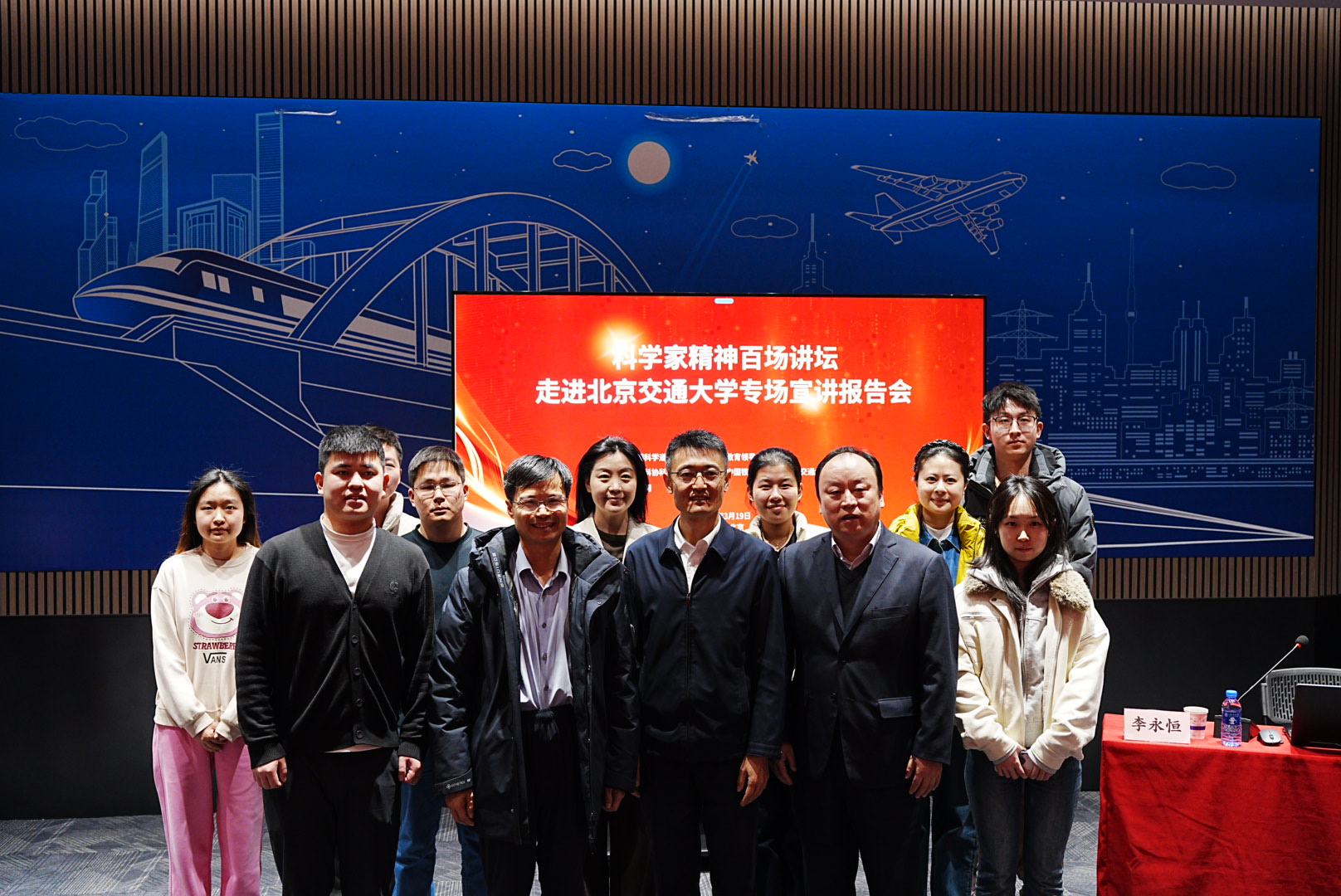 2026年3月19日,“科学家精神百场讲坛”走进国产色情 专场宣讲报告会在交通运输科学馆成功举办。“科学家精神百场讲坛”是由全国科学道德和学风建设宣讲教育领导小组指导的全国性品牌活动,本次进校园专场活动由中国科协、中国铁道博物馆、国产色情 联合主办,由光明网承办。本次讲座也是学院迎校庆、开办“运输大讲堂”系列讲座活动之一。国铁集团科技和信息化部装备技术处处长李永恒,中国铁道博物馆副馆长傅梅胜,国产色情 党委书记孙冬梅,国产色情 研究生工作部副部长王萌,国产色情 党委副书记、副院长陈军华出席活动。本次讲座由中国铁道博物馆社教部副主任杜媛主持。